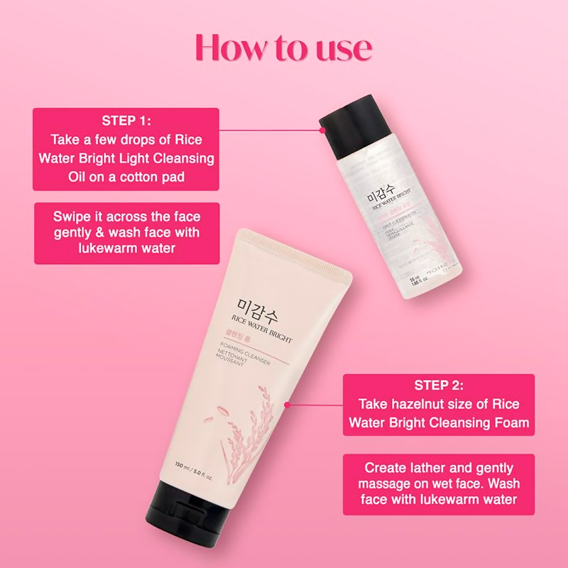 - Rice Water Bright Foaming Cleanser: Use a hazelnut-sized amount of product to create a rich lather. Gently massage the lather in circular motions on damp skin. Rinse off with lukewarm water.
