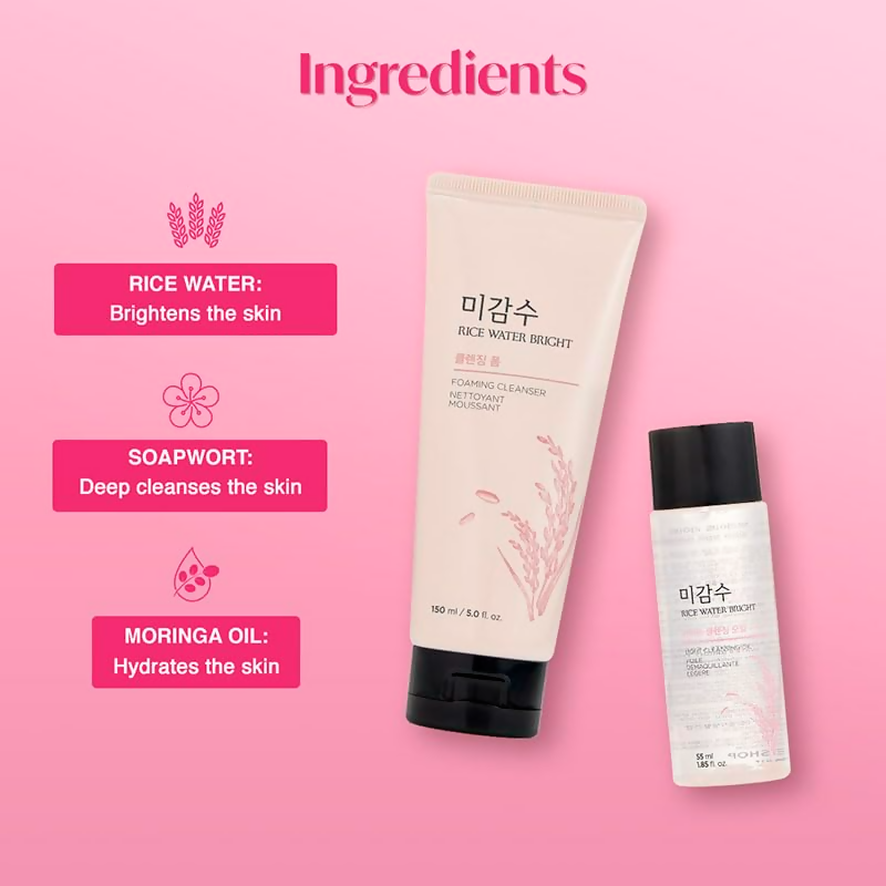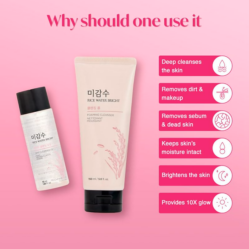 About the Product:- Experience the ultimate cleansing with the 2-Step Rice Water Bright Cleansing Kit, designed to effortlessly dissolve waterproof makeup and impurities, leaving your skin feeling pristine, rejuvenated, and moisturized. Whether used individually or together, this pair ensures a thorough deep-clean experience.