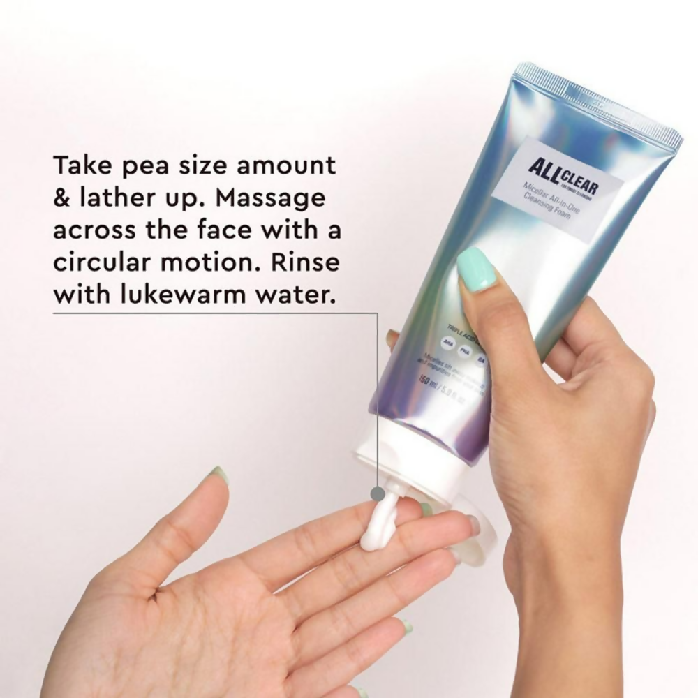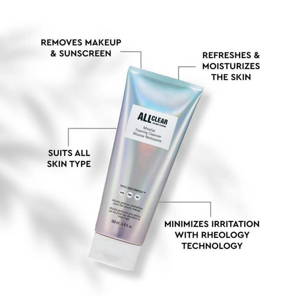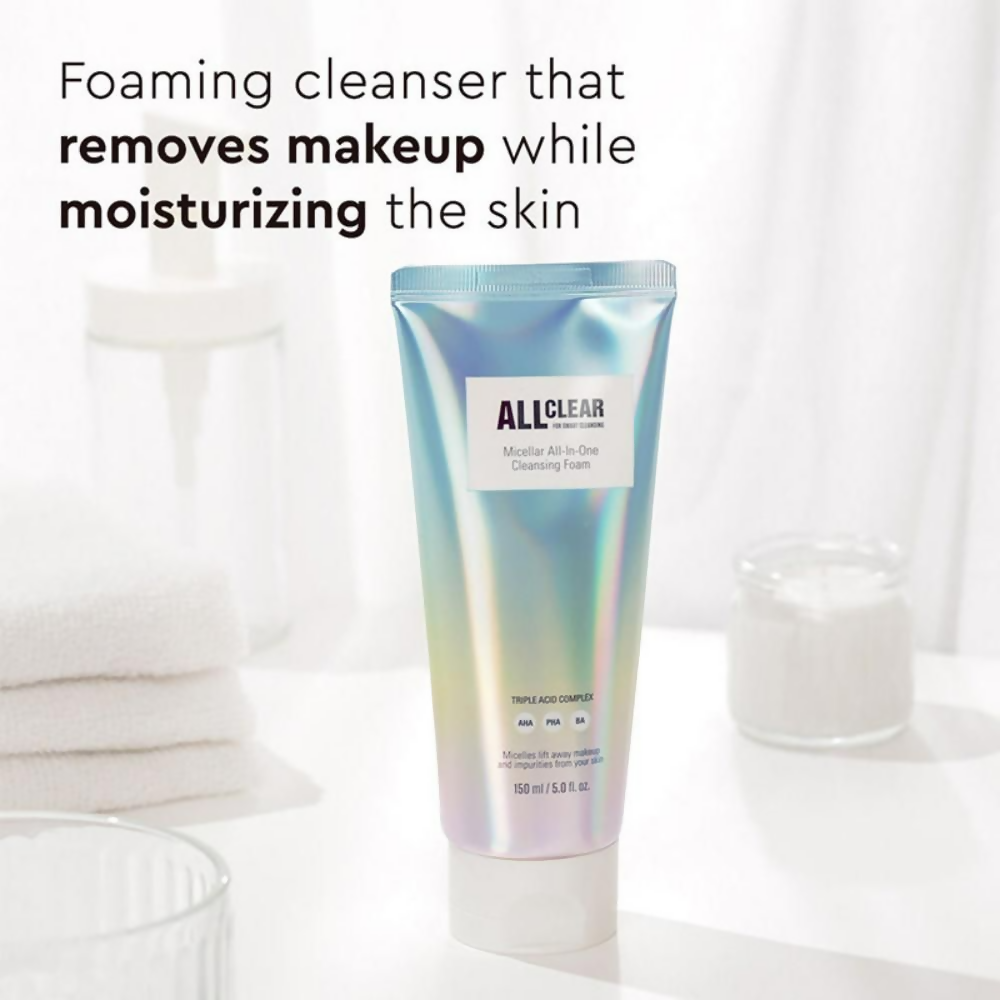 About the Product:- The Face Shop All Clear Micellar All-In-One Cleansing Foam is crafted to effectively remove minimal makeup, such as sunscreens and tone-up creams, without the necessity for a separate cleansing oil or cream. It features palm-derived cleansing agents that generate rich, resilient foam bubbles, ensuring a thorough cleanse that leaves the skin feeling refreshed and free from dryness or irritation. Additionally, the cleanser boasts a sub-acidic formula designed to minimize irritation while enhancing the cleansing experience.