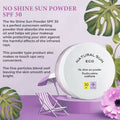 - The Natural Sun Eco No Shine Sun Powder is a lightweight, dry sunscreen offering comprehensive protection, perfect for the face, body, and scalp. It is housed in a refillable, compact case. Its luxurious, ultra-soft powder texture provides sun protection effortlessly with easy reapplication. This formula resists water for up to 40 minutes and can be applied solo or over cosmetics. Suitable and effective for all skin types, it is especially beneficial for sensitive and acne-prone skin.