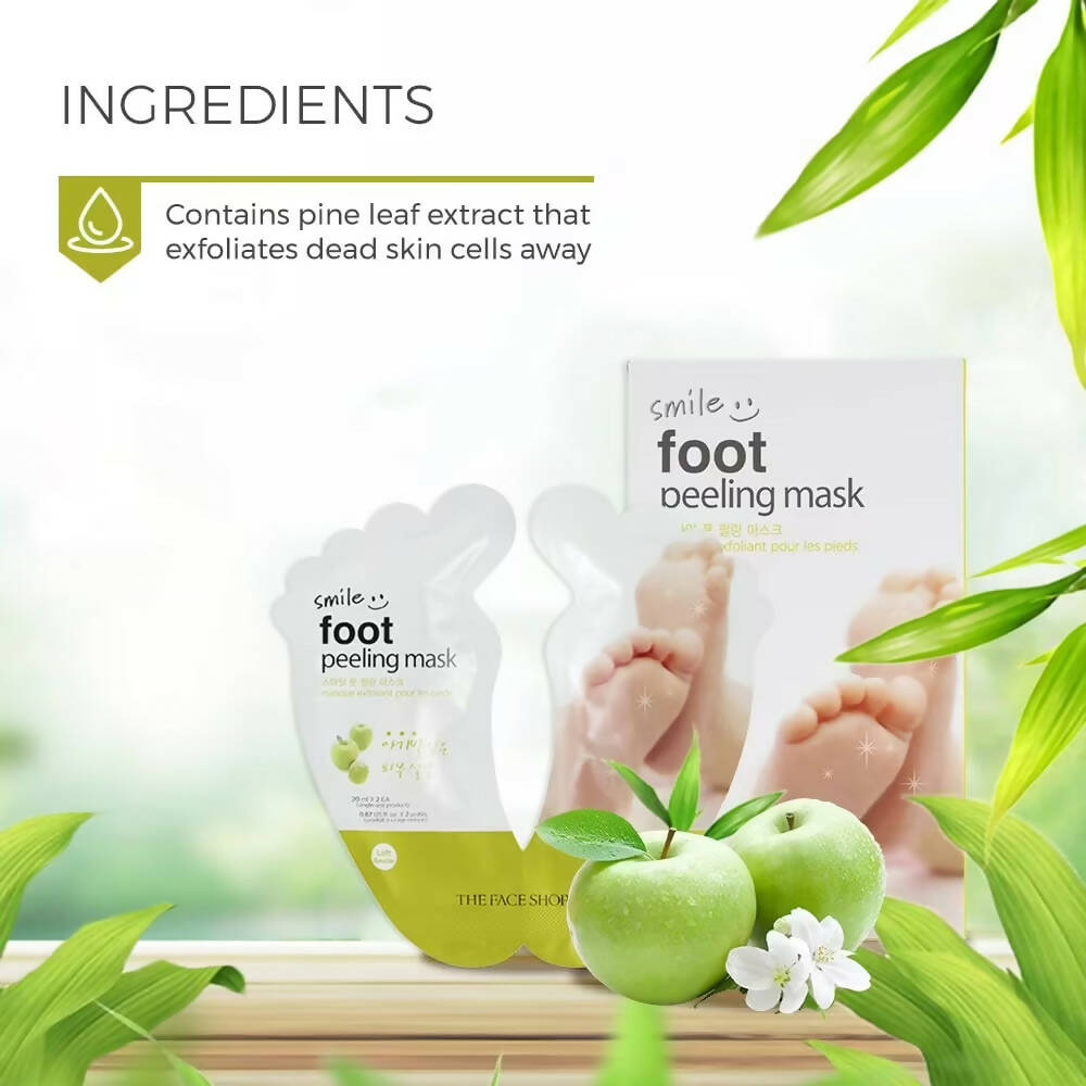 - The Face Shop exfoliating foot mask contains a skin liquid solution that effectively removes calluses, leaving feet smooth and soft. Natural plant-based ingredients soften rough skin, while pine leaf extract revitalizes and refreshes the skin. Indulge your feet and achieve silky soft skin with the Smile Foot Mask. It's incredibly easy to use, allowing you to unwind as they nourish and hydrate your damaged feet.
