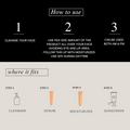 - After cleansing, gently pat your face dry and apply a pea-sized amount of the serum across your face, avoiding the eye and lip areas.