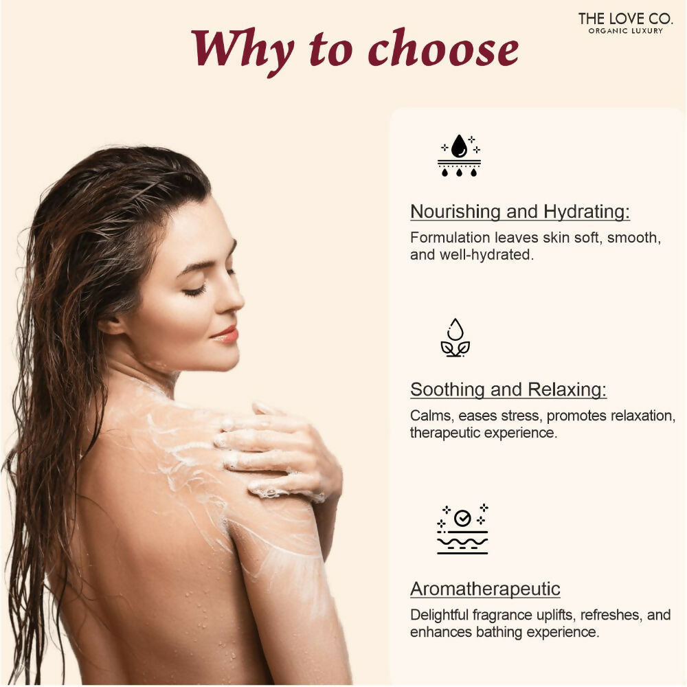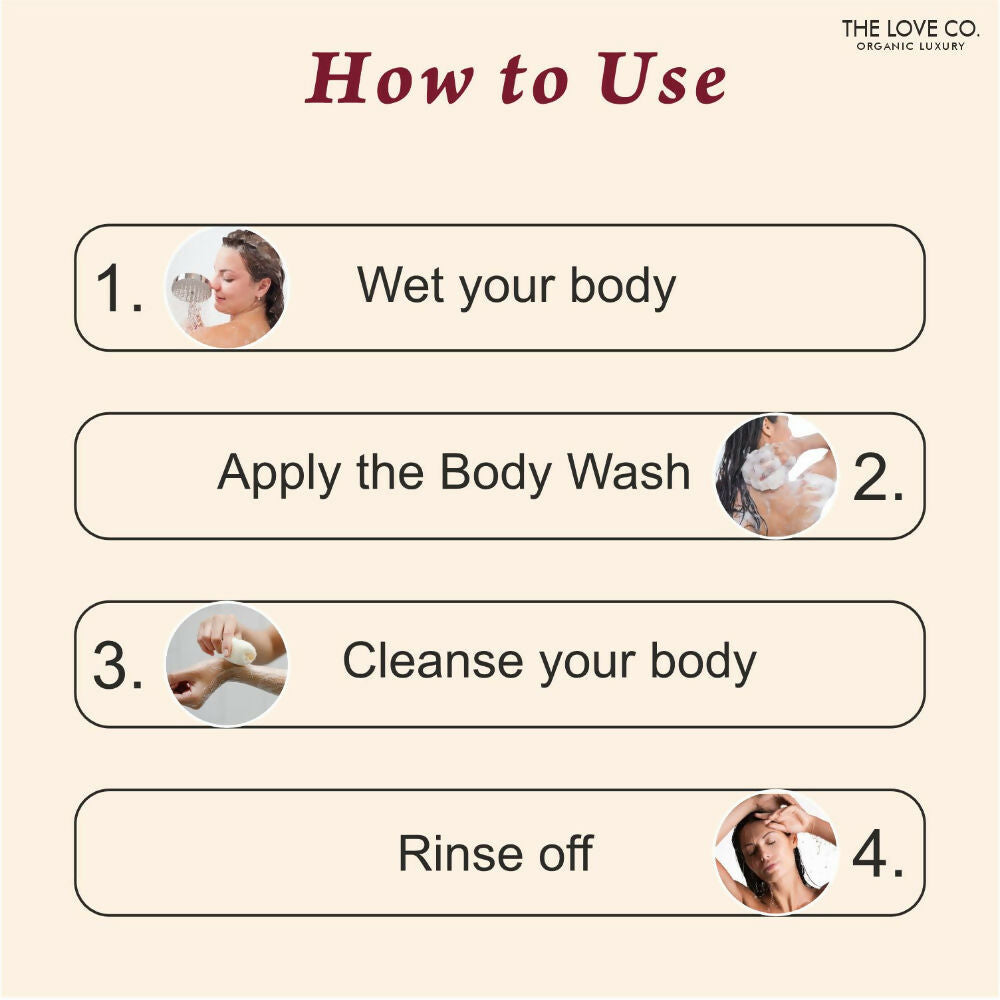 - Moisten your body with water and dispense The Love Co. Eiffel in Love Body Wash onto a wet loofah.