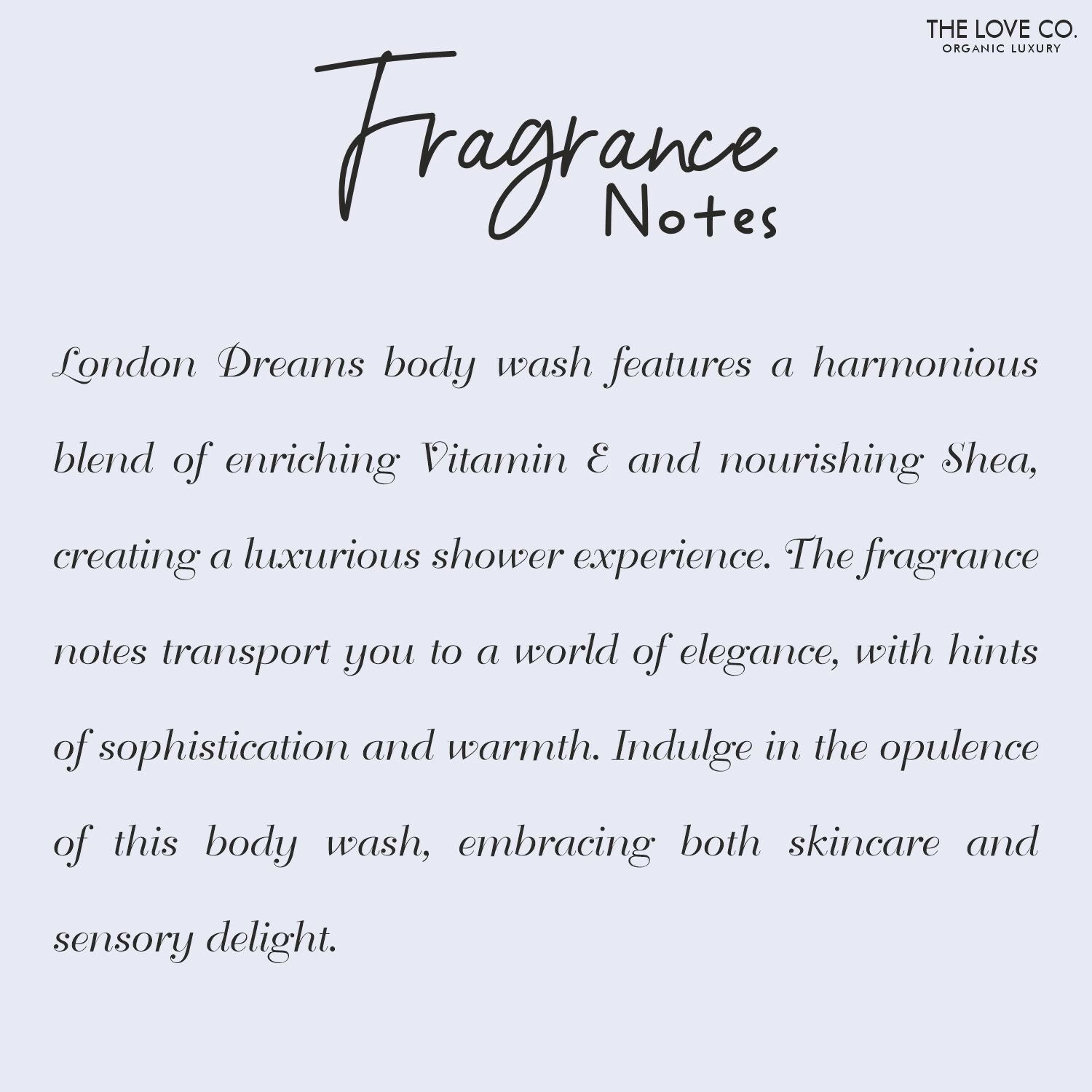 The Love Co. London Dreams Body Wash Shower Gel efficiently and delicately cleanses away impurities, oils, and germs with a luxurious, creamy foam that leaves skin feeling soft, smooth, and devoid of harsh chemicals. Infused with naturally sourced botanicals, it nourishes and calms dry skin.
