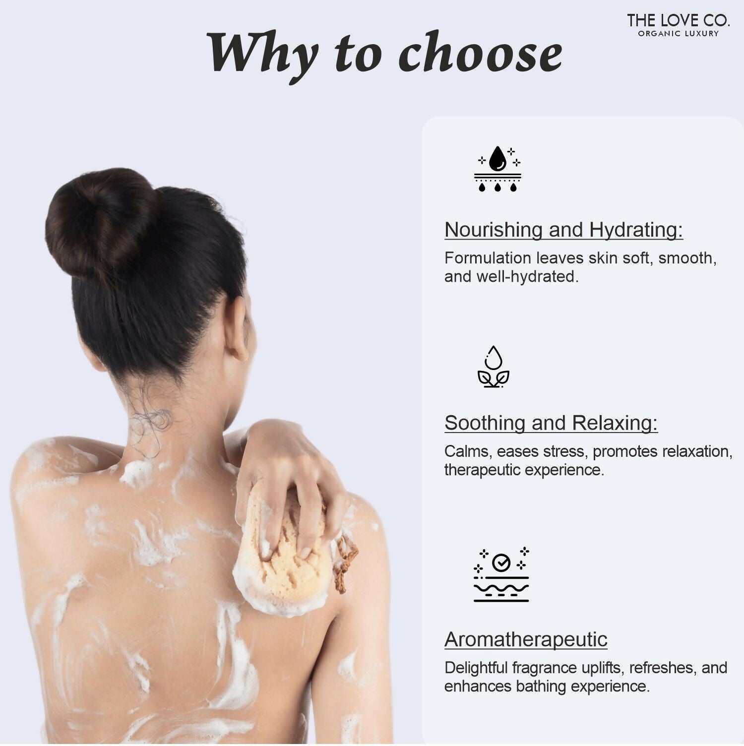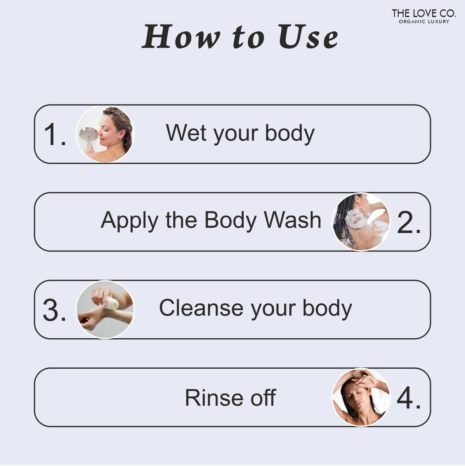 - Moisten your body with water and dispense The Love Co. London Dreams Body Wash onto the damp loofah.