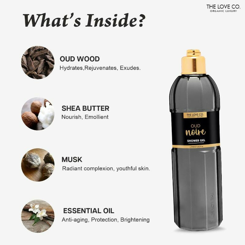The Love Co. Luxury Oud Noir Shower Gel is infused with a variety of nourishing essential oils and other components designed to hydrate your skin. Discover our exquisite collection of aromatic shower gels suitable for both men and women. Experience our luxurious liquid soap range for an invigorating body wash that includes lotions, handwash, and body butter. Unlike conventional soaps that may lead to skin dryness and discomfort, this body wash is crafted with your skin's health in mind, ensuring it remains gentle and non-stripping, making it ideal for the entire family to enjoy. The carefully chosen ingredients in this men's body wash enhance your skin's inherent moisture retention, leaving it soft with a smooth, silky finish.