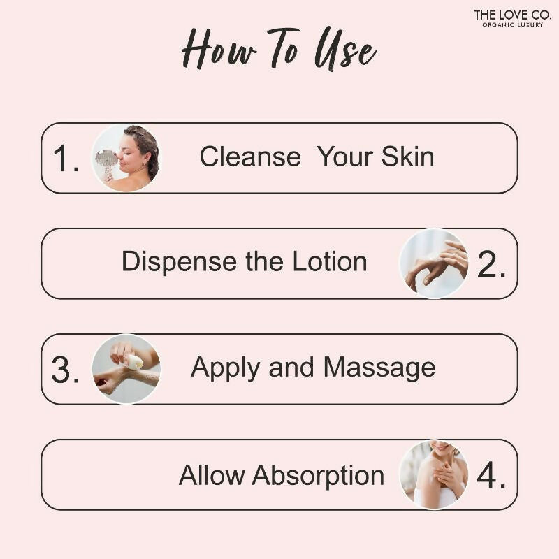 - Pay special attention when applying the body lotion to areas prone to dryness, such as elbows, hands, and heels.