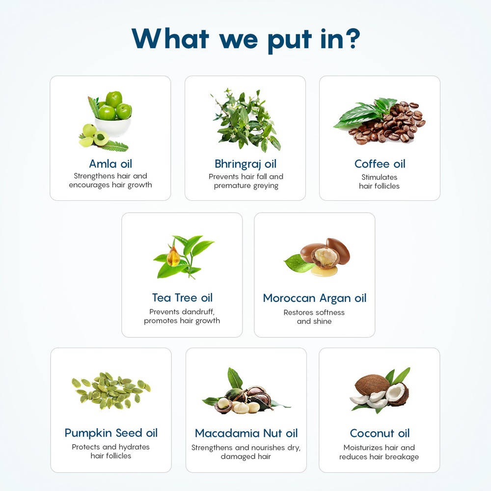 ENHANCES HAIR STRENGTH BY 77%: The Moms Co.'s Natural Hair Strengthening Oil effectively reduces hair fall and fortifies hair with its unique blend of 8 natural oils including Amla, Bhringraj, Coffee, and Tea Tree oils.