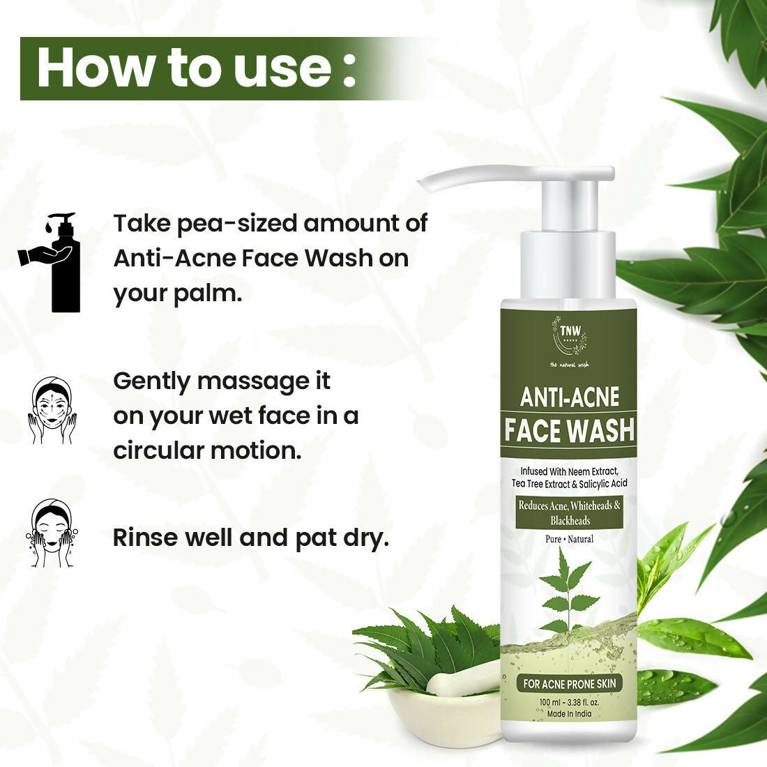 About the product:Welcome to a mild yet thorough cleansing experience with this face wash. TNW- The Natural Wash Anti-acne Face Wash is enriched with neem. It contains lemon peel extract, rosemary leaf extract, and tea tree oil that aids in eliminating blackheads and whiteheads. This anti-acne face wash effectively clears away dirt and impurities from your pores, leaving your skin looking clean and revitalized.