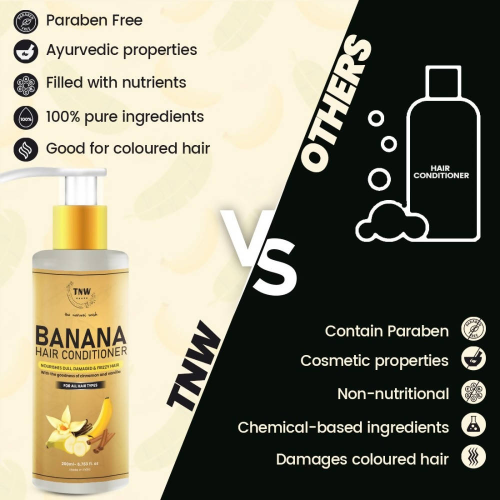 Description: Infused with authentic Banana extract, TNW Banana Hair Conditioner is a natural hair care solution that offers profound conditioning while providing essential nourishment, leaving your hair exceptionally smooth, glossy, and radiant. Using this natural conditioner post-wash infuses moisture into your tresses and helps prevent dryness and frizz. The inclusion of vanilla and cinnamon not only conditions the hair but also maintains hydration and shields against infections, making it an excellent choice for those with dry hair.Benefits: Free from Parabens & Sulphates, this natural formulation delivers deep conditioning to your hair. It hydrates and helps prevent dryness and frizz, adding a protective layer enriched with the benefits of cinnamon and vanilla. Leaves your hair feeling soft, manageable, and well-nourished.