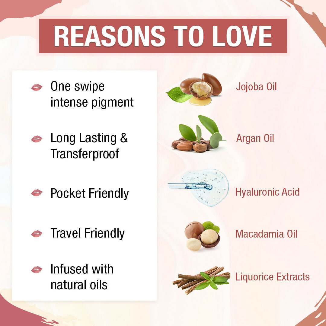 About the product:The Natural Wash presents the Matte Velvet Longstay Liquid Lipstick in a compact mini size! This lipstick boasts a nourishing blend, enriched with Macadamia Oil and Argan Oil, offering a matte finish that is transfer-resistant, lightweight on the lips, and perfect for everyday wear.