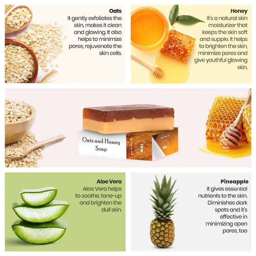 Description: The combination of Oats and honey is beneficial for a healthy body and skin. TNW handmade Oats and Honey Soap is the best soap for dry skin as it has the goodness of honey and glycerin. This natural handmade bar is a Paraben and Sulphate-free soap that cleanses the skin and exfoliates it by removing tan, dark spots, and blemishes. This soap for dry skin lightens up the tanned areas and gives it a refreshing glow naturally. We consider consuming Oats as a favorite breakfast cereal, but we overlook the endless benefits this wonder ingredient provides. Now, TNW brings a new epitome of oatmeal in Oats & Honey Soap, which is quite effective for the skin. This Ayurvedic soap for dry skin helps reduce the pores on the skin while removing the dead skin cells. It is also beneficial in reducing acne scars while avoiding skin from becoming dry. This Sulphate free soap for dry skin naturally exfoliates the skin, eliminates dirt and pollutants, and allows the skin to breathe freely.Legal Disclaimer: The product is guaranteed to be 100% genuine. Product images are for illustrative purposes only. Images/packaging/ labels may vary from time to time due to the manufacturer's manufacturing batch and location changes. The product description is for information purposes only and may contain additional ingredients