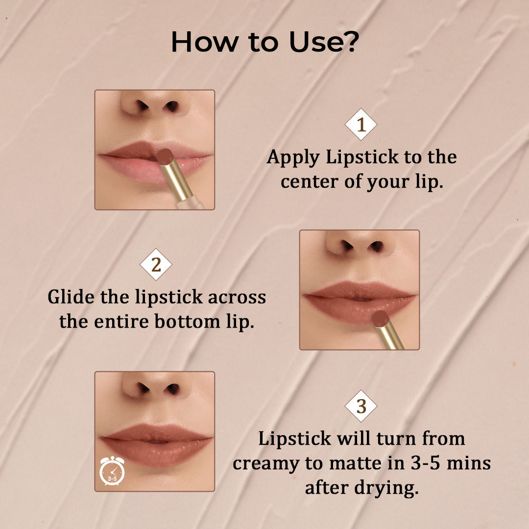 - Apply lipstick to the center of your upper lip & glide the lipstick across the entire bottom lip.