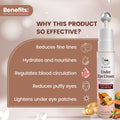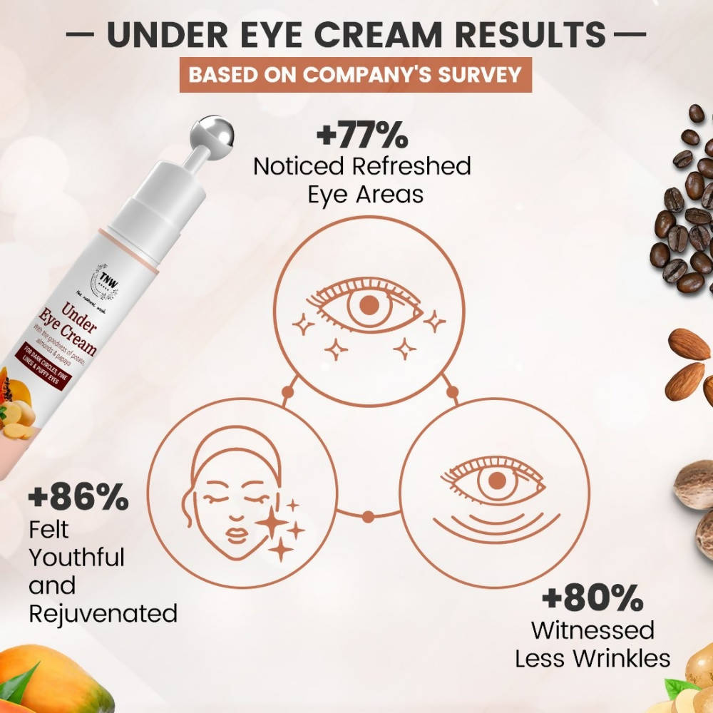 Description: The skin beneath our eyes is exceptionally sensitive, often revealing signs of aging, damage, and daily stress sooner than other areas, making its care crucial. TNW-The Natural Wash has developed one of the finest under-eye creams to maintain your skin's vitality. This under-eye cream functions as an anti-aging treatment, addressing dark circles and fine lines. It is formulated with a blend of natural ingredients such as Papaya, Potato, and Almonds, providing your skin with essential nutrients and vitamins.Benefits: It aids in reducing dark circles, soothing puffiness, and diminishing fine lines (crow's feet). The roller eye massager offers immediate relaxation and simplifies application. It alleviates under-eye bags and rejuvenates tired eyes. This under-eye gel is free from Parabens and other harmful chemicals, making it suitable for dark circles.