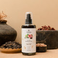 Extra Virgin Black Sesame Seed Oil enriched with the essence of Sun-Dried Hibiscus, Sun-Dried Bhringraj, Fenugreek, Wild Indian Gooseberries (Amla), Vetiver, Kachuralu, Bavanchalu, Tunga Musta, a touch of Sun-Dried Curry Leaves & Nothing Else…