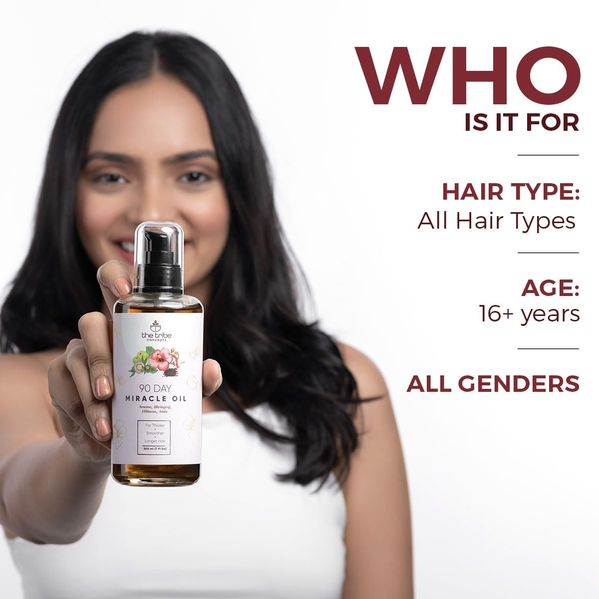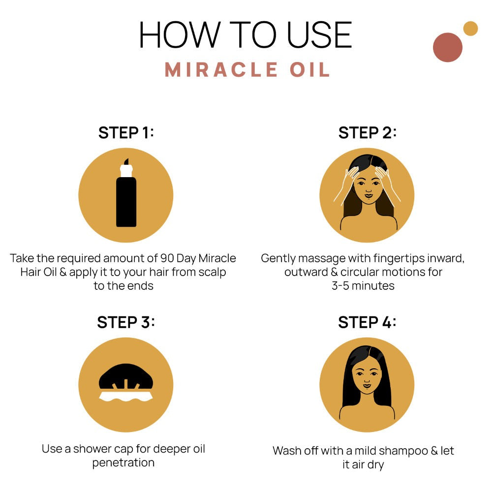 Dispense the necessary amount of “THE TRIBE CONCEPTS - 90 DAY MIRACLE HAIR OIL” and apply thoroughly from the scalp to the tips of your hair. Gently massage using your fingertips in inward, outward, and circular motions for 3-5 minutes to invigorate the follicles and leave it on for an hour or two. For enhanced penetration, use a shower cap. Rinse out with a gentle shampoo and allow your hair to air dry.