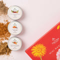This set features three of our top-selling masks, crafted with genuine Ayurvedic ingredients that deliver visible results. The potent blend of Himalayan SJ and Saffron in the Collagen Mask enhances the skin's natural collagen production and boosts firmness. The Glow mask, enriched with Marigold and Chironji, promotes a radiant complexion and diminishes pigmentation. Sandalwood and Rose petals in the Brightening Mask help refine pores and provide balanced moisture.Included in this set: