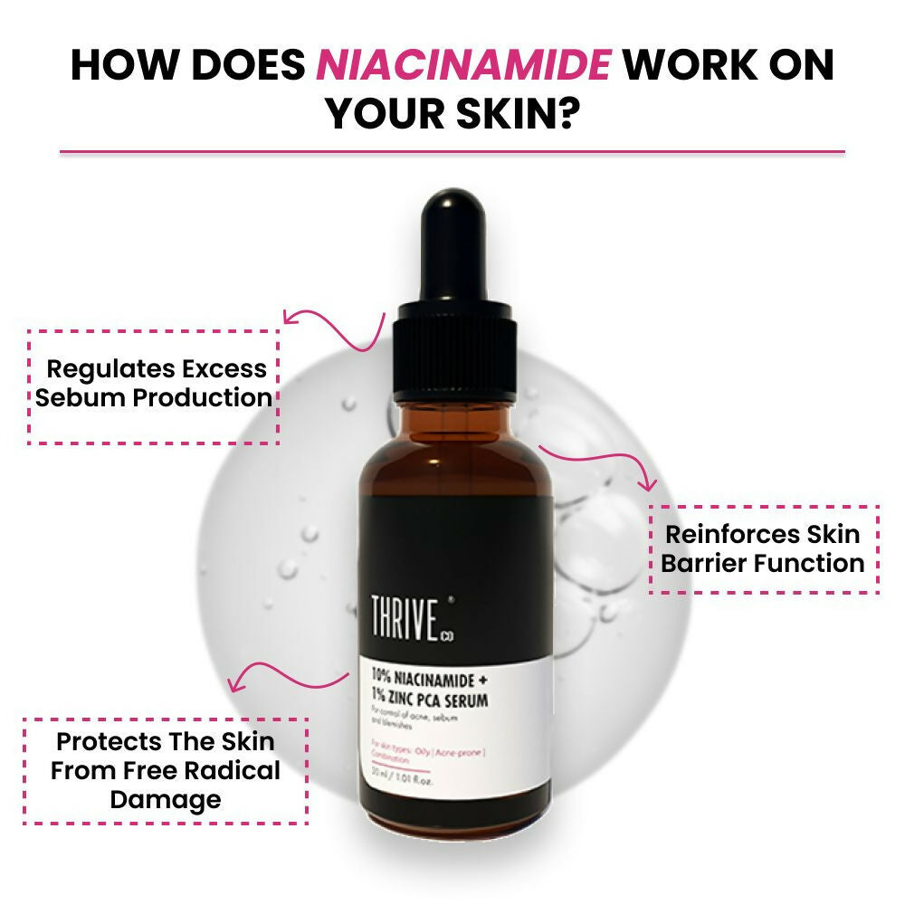 - "ThriveCo 10% Niacinamide + 1% Zinc PCA Serum is the perfect solution for addressing acne and blemishes simultaneously. Niacinamide targets acne scars and persistent blemishes, while Zinc PCA helps regulate sebum production to focus on acne. This lightweight, non-greasy serum formula quickly absorbs into the skin, reducing excess melanin production caused by skin damage at acne sites, unveiling a more even and radiant complexion. Designed for oily, acne-prone, and combination skin types, this comprehensive serum is 100% effective in targeting pigmentation, acne-causing sebum, and bacteria.