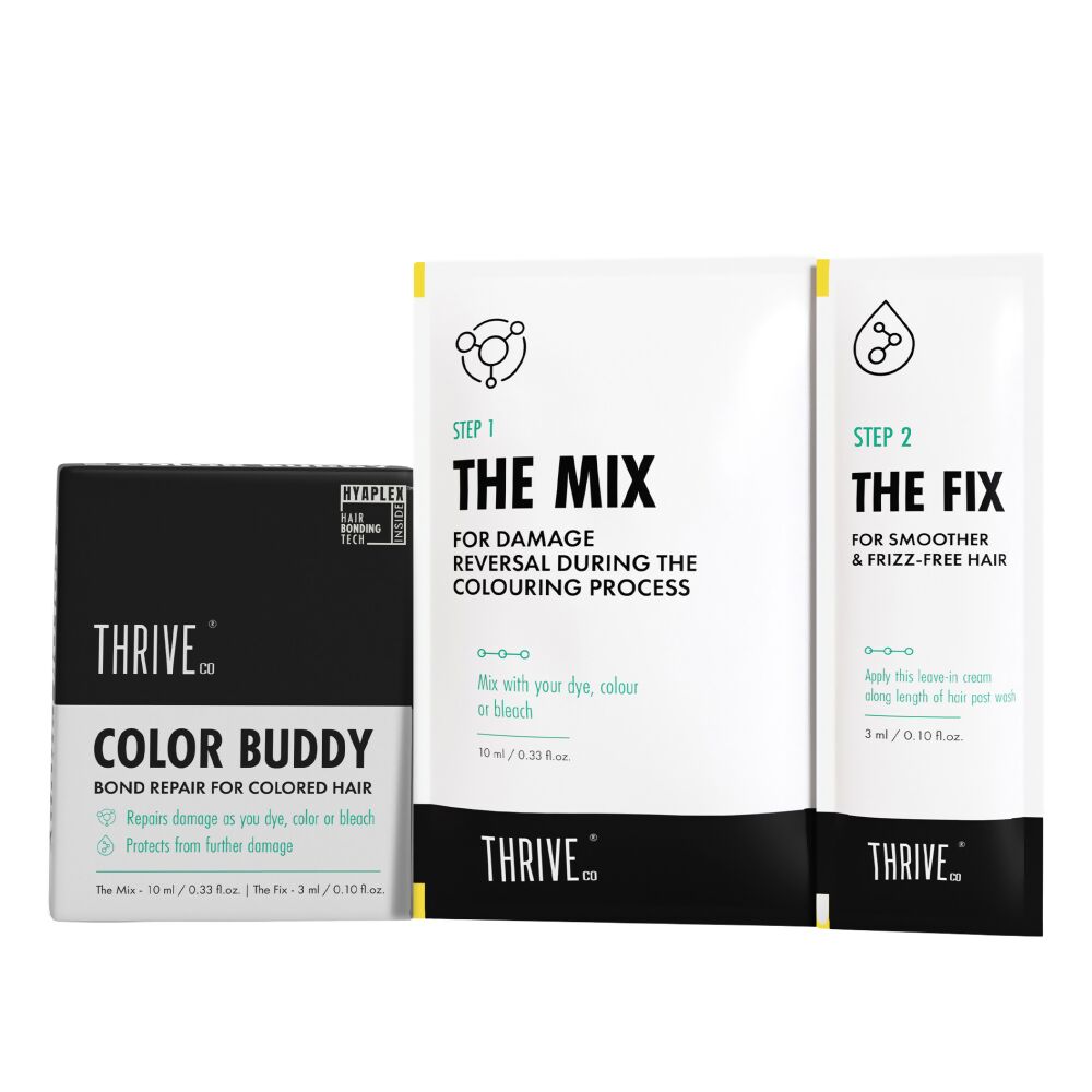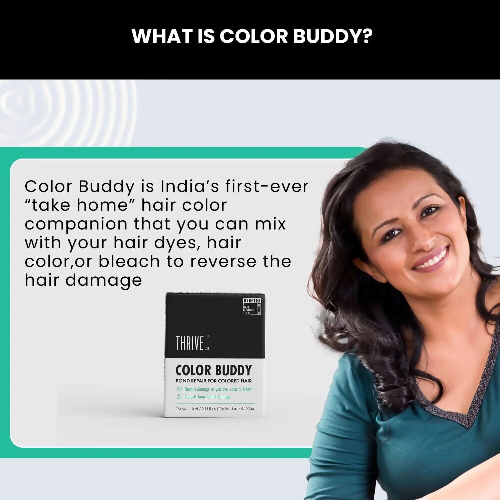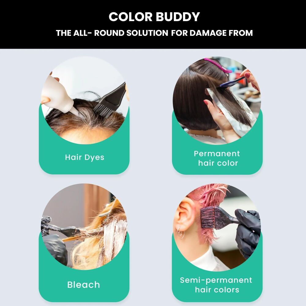 - Experience the freedom to dye your hair without the risk of harm, thanks to HyaplexTM. Introducing Color Buddy, India's pioneering 'at-home, DIY, damage-reversal treatment. Simply incorporate it into your hair coloring regimen to counteract the damage from bleach, ammonia, and other harmful substances. It repairs damage at a molecular level by reconstructing the broken bonds and provides a protective shield for your hair. Achieve damage-free hair color with Color Buddy, a powerful duo enriched with HyaplexTM, a cutting-edge third-generation hair bond-building technology that restores damaged, broken hair bonds at a molecular level. It rejuvenates the hair structure from within and also creates a protective barrier to prevent further harm.