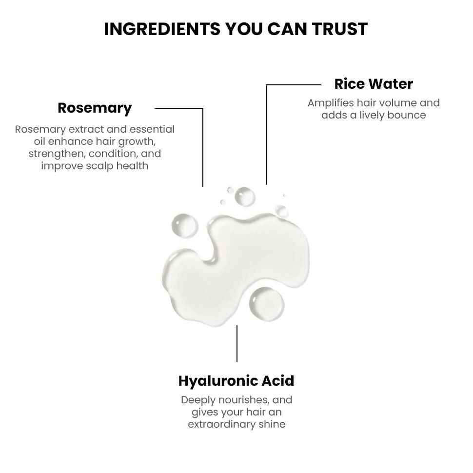 - SAFE AND POTENT INGREDIENTS: Revered through the ages for its capacity to rejuvenate hair and scalp health, rosemary extract along with essential oil excels in promoting hair growth, fortifying, conditioning, and enhancing scalp wellness. Additionally, rice water increases hair volume and adds buoyant bounce, while hyaluronic acid deeply nourishes, imparting an exceptional shine to your hair.