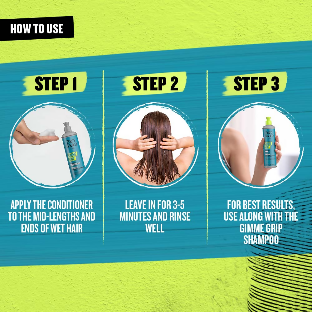 About the product:The Bed Head Gimme Grip Texturizing Hair Conditioner is perfect for those desiring salon-level hair volume enhancement right at home. Crafted and utilized by salon experts, this professional-grade conditioner amplifies volume, body, and texture, enriching your hair's overall look. Thanks to its Fibre Thickening Technology, this hydrating conditioner nourishes, conditions, and augments hair fibers, giving your hair a visibly fuller appearance.