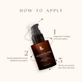 - Apply 3-4 drops of Serum onto your palm. Distribute the serum evenly between your palms with gentle movements.