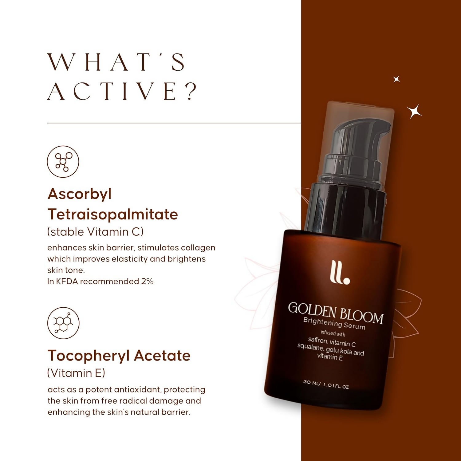 - The Golden Bloom Serum features SQUALANE, a potent moisturizing element celebrated for its ability to deeply penetrate the skin. This ensures your skin stays richly hydrated throughout the day, preserving a soft, supple feel.