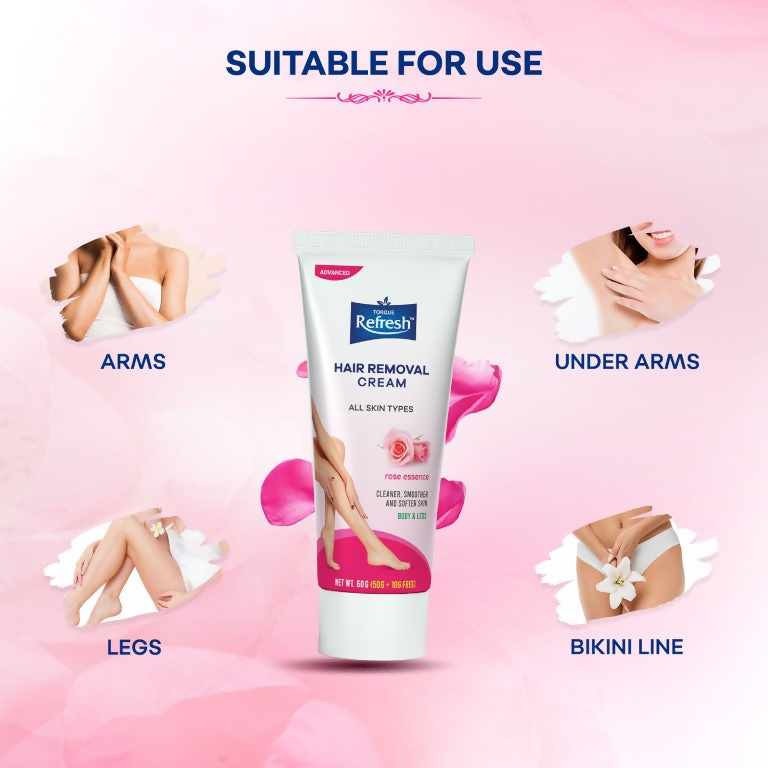 Discover the soothing embrace of nature with Torque Refresh Hair Removal Cream, infused with the essence of natural rose. Our distinctive formula brightens and removes tan from your skin, providing a flawless, hair-free appearance without the risk of skin discoloration. Effortlessly Remove Fine Hair: Enjoy a painless method to eliminate fine hair from your legs, arms, and underarms.