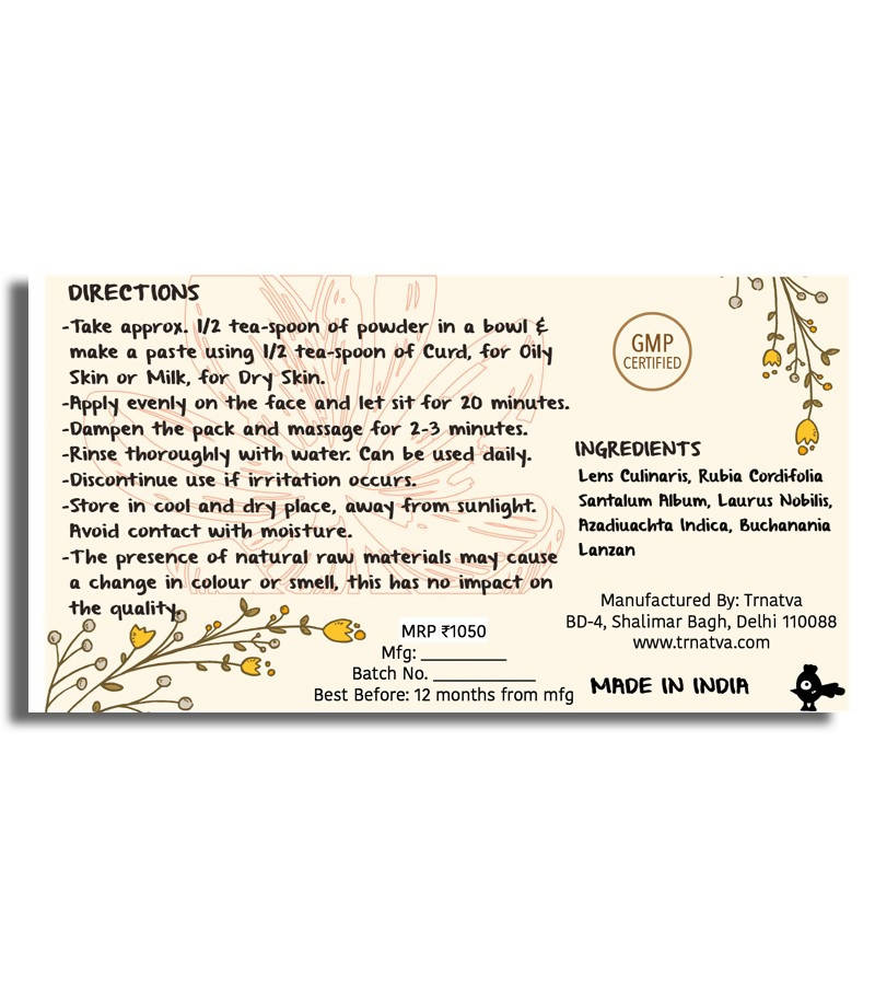 - Create a smooth paste by mixing 1 teaspoon of the pack with 1 teaspoon of milk for dry skin, or 1 teaspoon of curd for oily or combination skin. Spread evenly across the face and let it rest for 15 minutes. Once the pack has dried, moisten it slightly with wet hands and gently massage for a minute. Rinse off thoroughly.