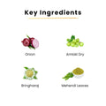- Bhringraj, Manjistha, Kumari, Mehandi, Amlaki, Bhrami, Chandan, and Onion