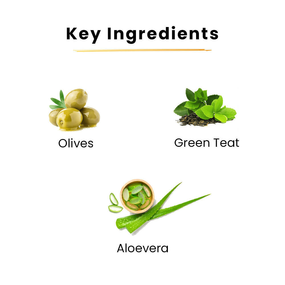 - Aloe vera, Green tea, Olive oil, Castor Oil, Tea tree extract, and Niacinamide.