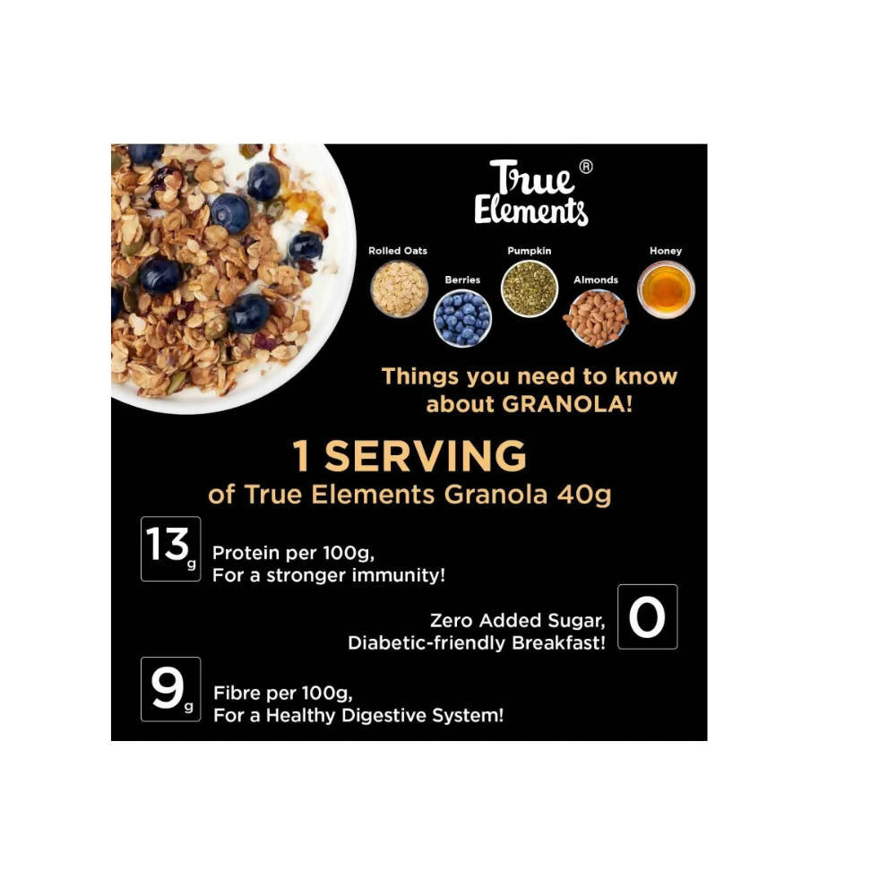 True Elements Baked Granola serves as an ideal breakfast and nutritious snack alternative, crafted with the wholesome goodness of natural, whole-grain rolled oats, wheat flakes, seeds, raw honey, Almonds, dried cranberries, and more. Our granola is expertly baked until it reaches a crispy, golden-brown perfection. It is an excellent choice for individuals aiming for weight management.