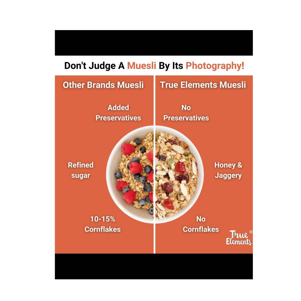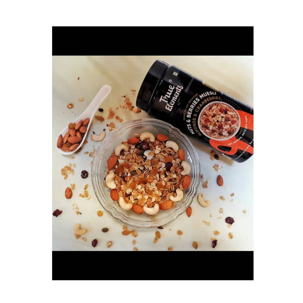 True Elements Crunchy Nuts and Berries Muesli offers a wonderfully convenient, ready-to-eat breakfast choice. It features a blend of whole grains including rolled oats, wheat flakes, jowar flakes, seeds, raw honey, dried berries, Almonds, and more. This muesli is exceptionally high in vitamins and minerals.