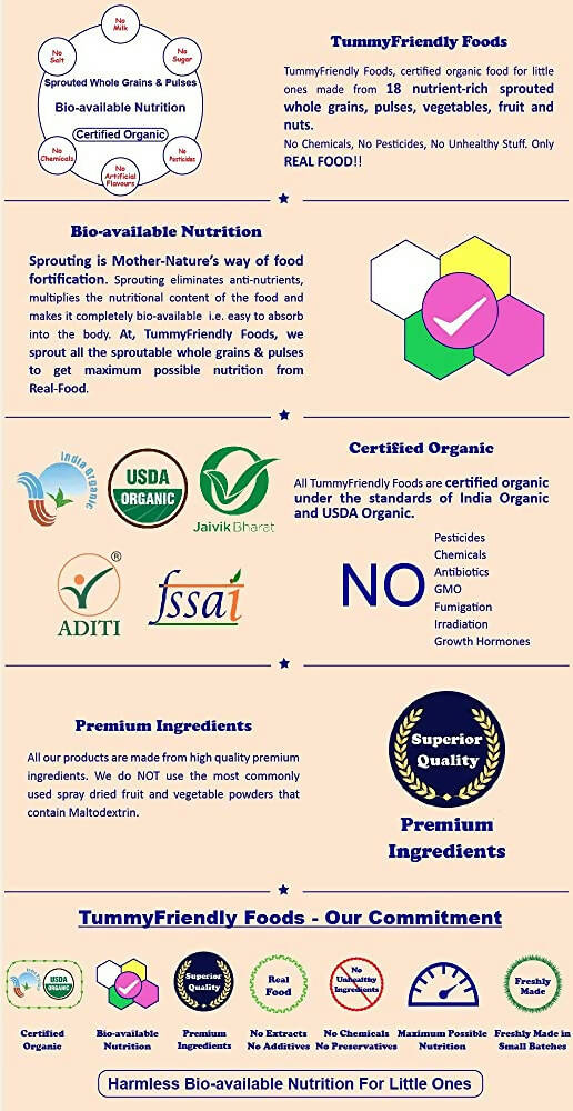 TummyFriendly Foods offers a Certified 100% Organic Sprouted Ragi, Oats, Red Lentil, Banana Porridge Mix. Crafted from Sprouted Whole Grain Ragi and Oats, it is abundant in Calcium, Iron, Fiber, and essential Micro-Nutrients. Available in a 200g Cereal pack (200 g).