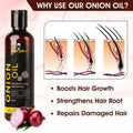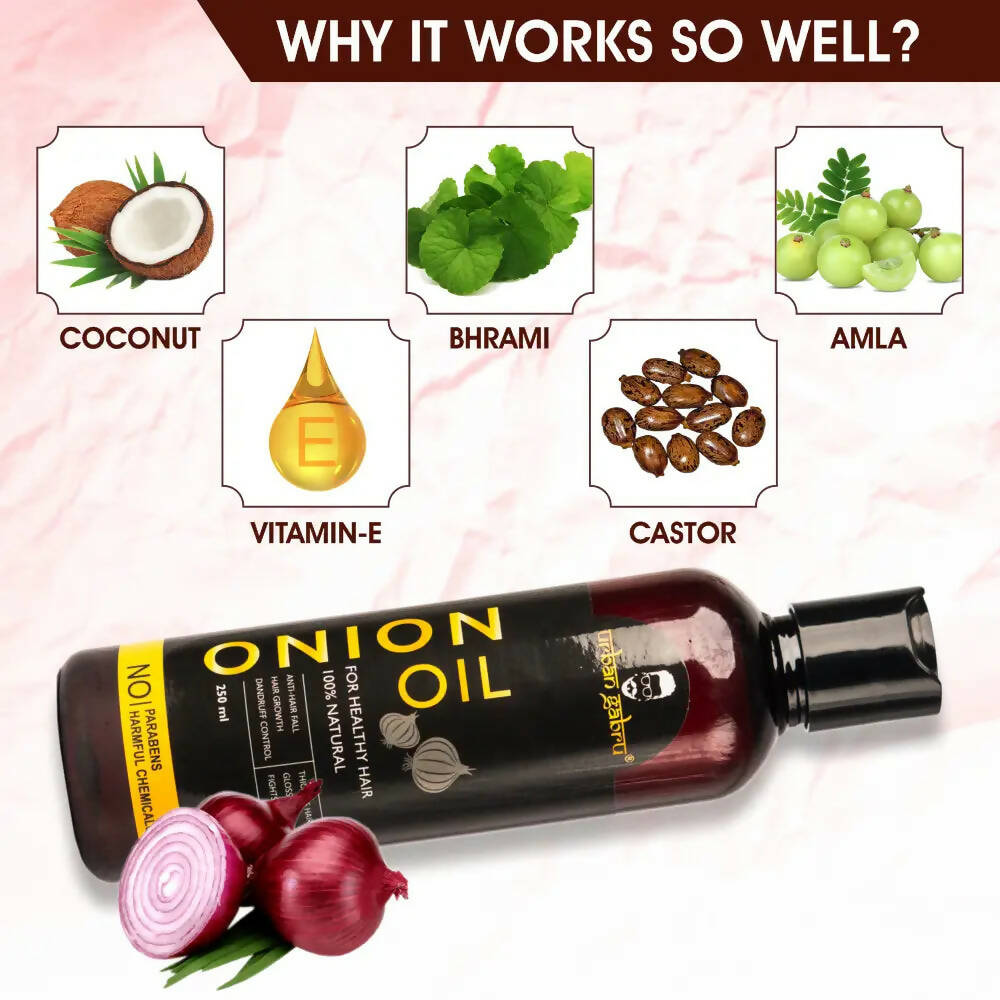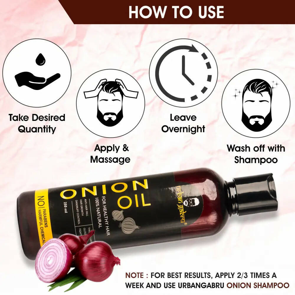 - Urbangabru Onion Oil is enriched with potent hair growth ingredients such as sulfur and amino acids that contribute to obtaining robust, voluminous, and vibrant hair when applied to both hair and scalp. It comprises a fusion of Red Onion Oil, Argan Oil, Jojoba Oil, Coconut Oil, Bhringraj, Amla, Brahmi, Vitamin E, Castor Oil, Jojoba Oil, Hibiscus, Mango Butter, Shea Butter, Sandalwood Oil, and Rose Oil. This blend aids in stimulating hair growth while preventing issues like hair fall, breakage, thinning, scalp infections, dandruff, and similar hair-related concerns. The sulfur component facilitates collagen production, essential for the formation of healthy hair growth cells. Consistent use of this oil enhances blood circulation in your scalp, thereby promoting hair growth.