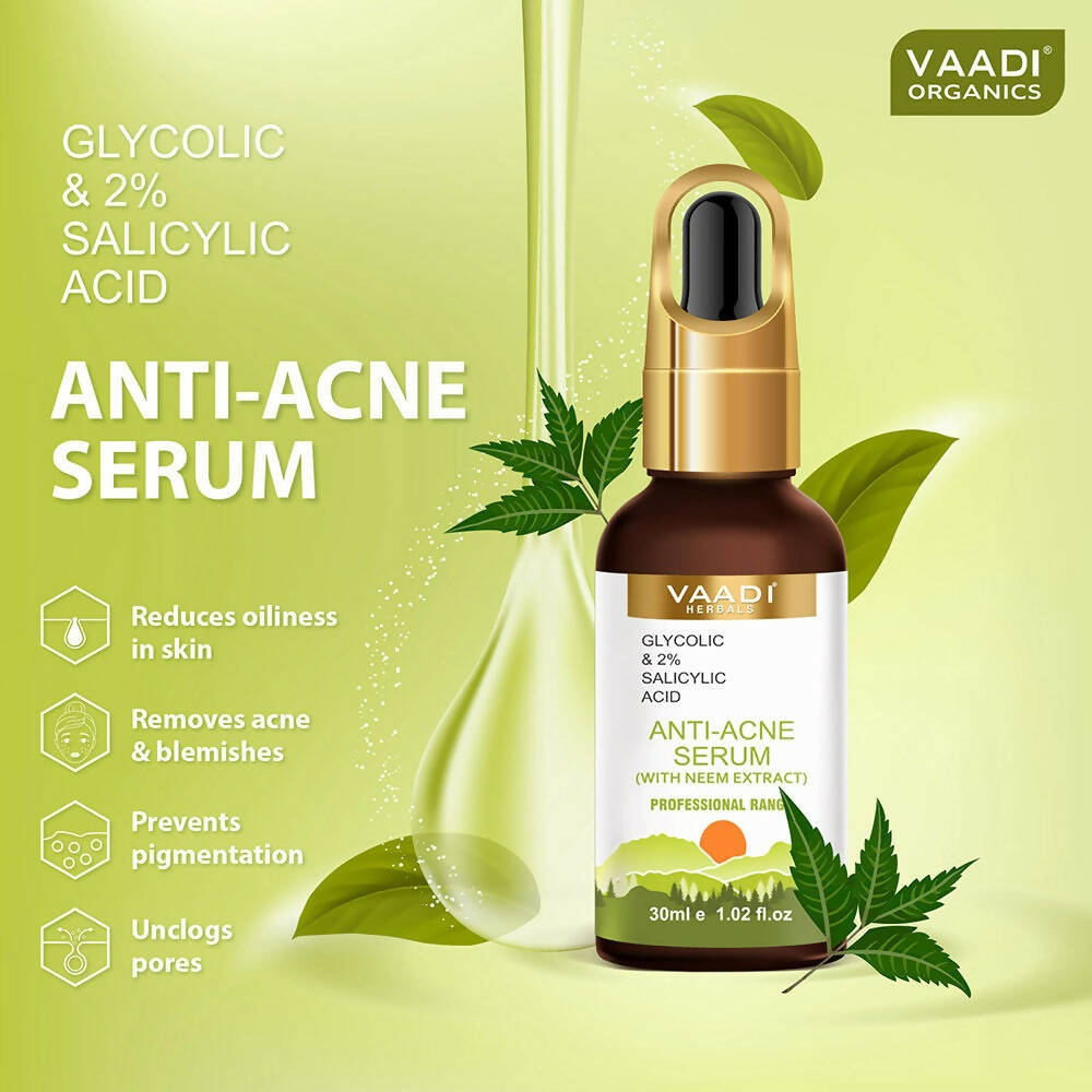 - The Vaadi Herbals Anti-Acne Serum, enriched with glycolic and 2% salicylic acid, is superb for minimizing acne and imperfections by controlling excessive oil on the skin. The salicylic acid in this blend effectively exfoliates the deeper skin layers and penetrates pores to eliminate oil, grime, and bacteria. It thus prevents acne, blackheads, and whiteheads by purifying the skin of impurities.
