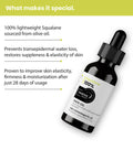 - 100% pure Squalane, derived from olive oil, is featherlight. It helps prevent moisture loss through the skin, enhancing its smoothness and flexibility.