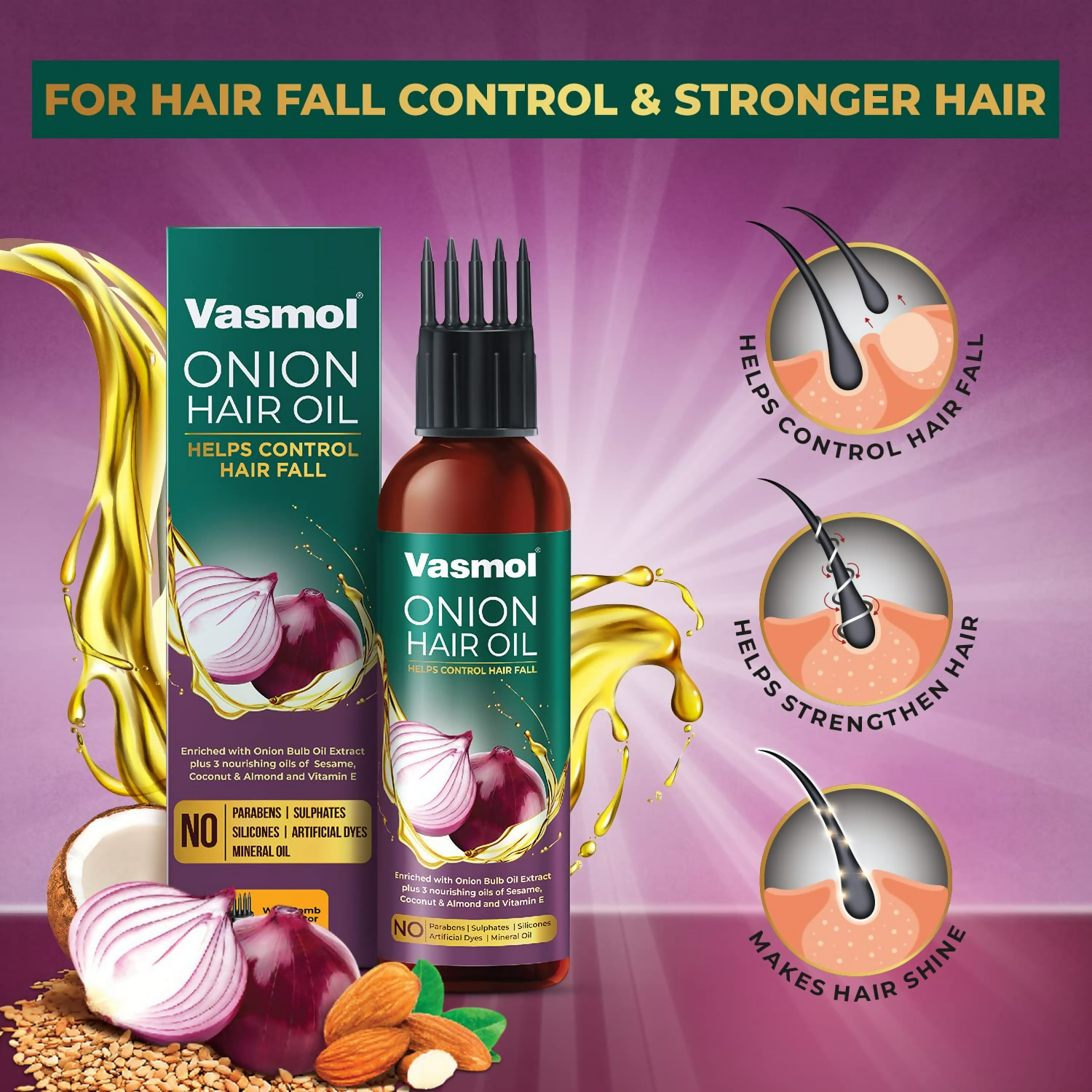 About the Product:- Reduces hair fall - Vasmol onion hair oil is enriched with the benefits of onion bulb oil extract, almond oil, sesame oil, coconut oil, and Vitamin E, which effectively diminishes hair fall by up to 3 times.