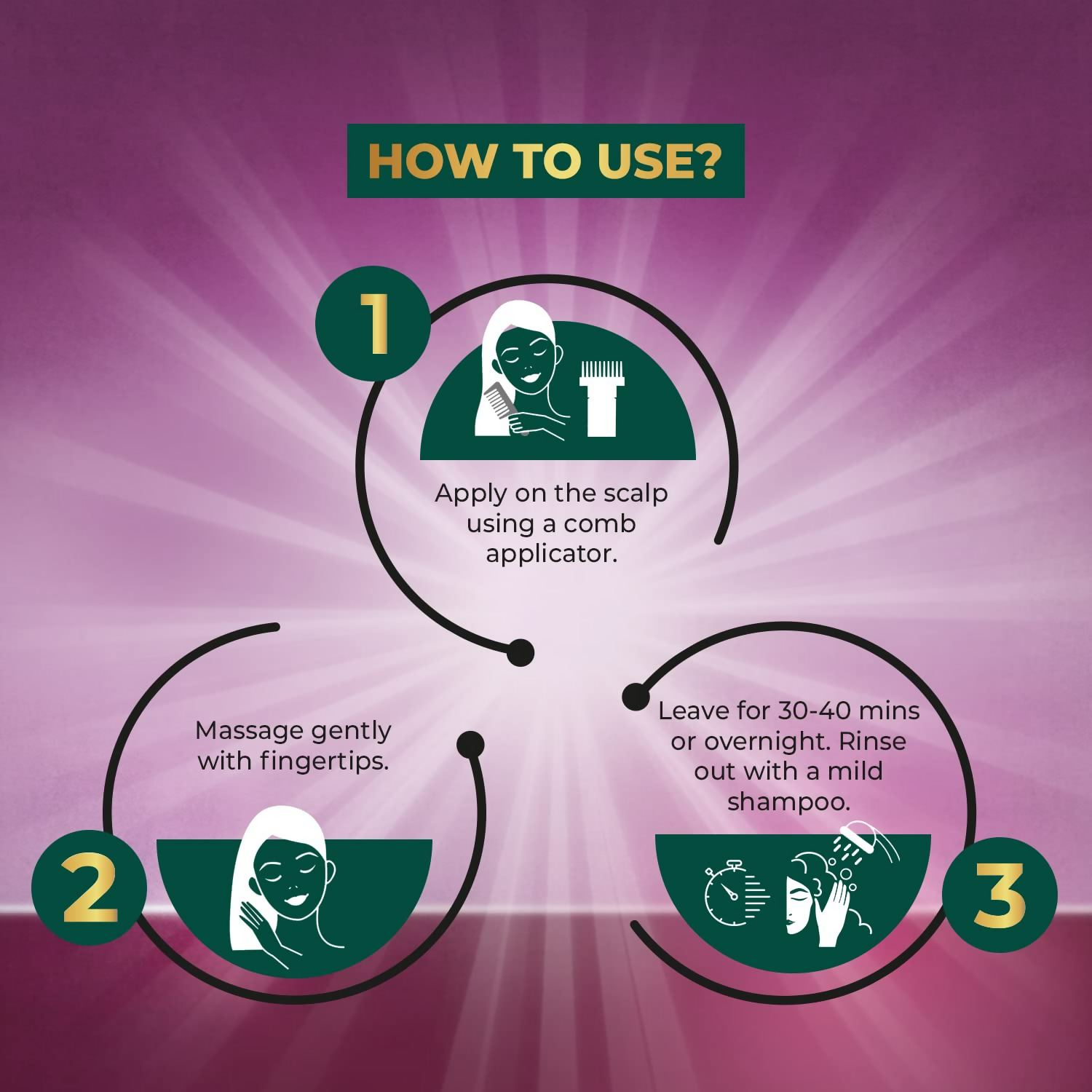 - Apply to the scalp using a comb applicator. Gently massage with your fingertips. Leave it on for 30-40 minutes or overnight. Rinse out with a mild shampoo.