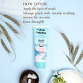 - Wash the face & apply a layer of the scrub Massage gently with circular scrubbing motion for 2-3 mins and Rinse off with water thoroughly.