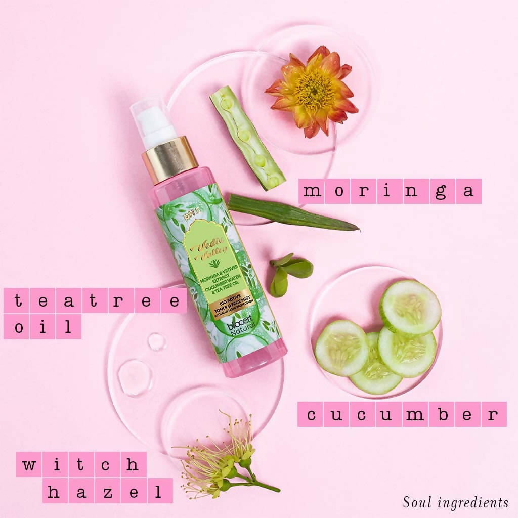 - Bio Active Toner & Face Mist Moringa & Vetiver Our Source and Soul This exceptionally light, alcohol-free mist cloaks the skin in an airy layer that bolsters the skin's defense against city pollution. Every spritz penetrates deeply into the skin layers, revitalizing each cell and leaving a dewy, satin-like finish. Crafted with effective blue light filters to guard against photoaging due to blue light exposure, it also soothes the skin after sun exposure. It cleanses and refines the pores while balancing the skin's pH level. The citrus aroma of orange blossom will instantly elevate your spirits. Infused with skin-nurturing ingredients, it offers botanical nourishment that repairs skin damage and revives the natural microbiome.