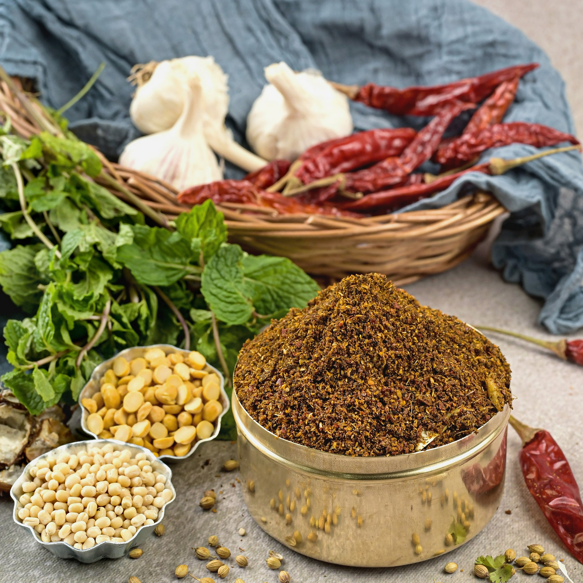 - Mint leaves, Black gram (Urad dal), Bengal gram, Tamarind, Coriander seeds, Garlic, Red chilli powder, Cumin seeds, Groundnut oil, Salt