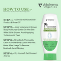 - Step 2: Apply Volamena In-Shower Body Moisturizer lotion on damp skin while still in the shower. Avoid applying to the soles of your feet.