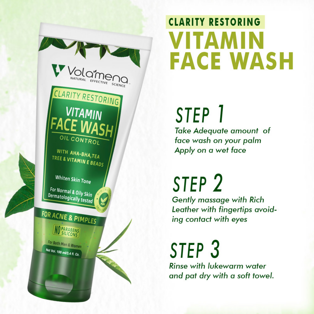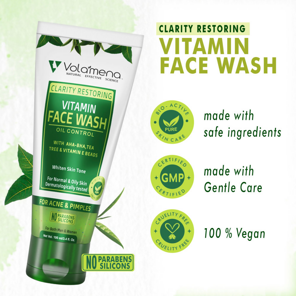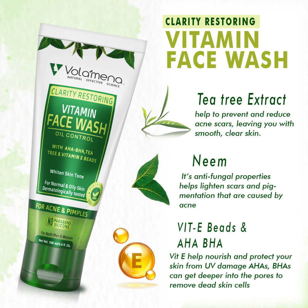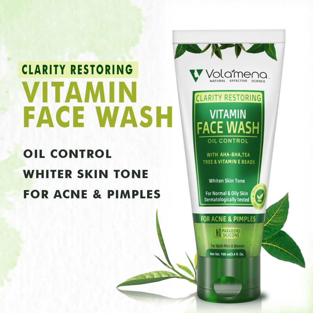 About the Product:- The Volamena Clarity Restoring Vitamin Face Wash is an exceptional facial cleanser featuring an advanced blend of alpha and beta hydroxy acids (Glycolic and Salicylic acid) in a stable, safe composition to balance skin tone and brighten complexion. Infused with Tea tree oil and Neem extract, these potent anti-acne components deliver dual benefits of acne reduction and skin brightening, gently exfoliating and purifying the skin. Enhanced with Glycolic acid and Liquorice root extract, it effectively diminishes dark spots and evens out skin tone. Aloe vera and Vitamin E beads provide hydration and healing benefits. Salicylic acid, Tea tree oil, and Neem leaf extract possess antimicrobial properties that treat acne and blemishes. Allantoin and Niacinamide support cell renewal and enhance skin texture.