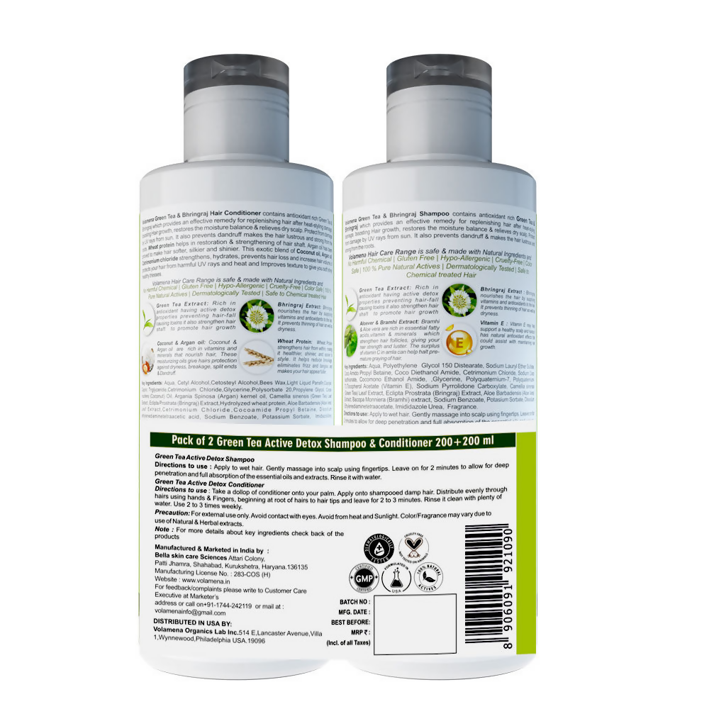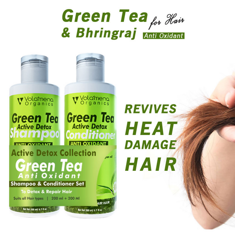 - The Volamena Green Tea & Bhringraj Shampoo and Conditioner features a blend enriched with green tea and bhringraj, renowned for their antioxidant properties. This combination effectively revives hair from styling damage and stimulates hair growth.