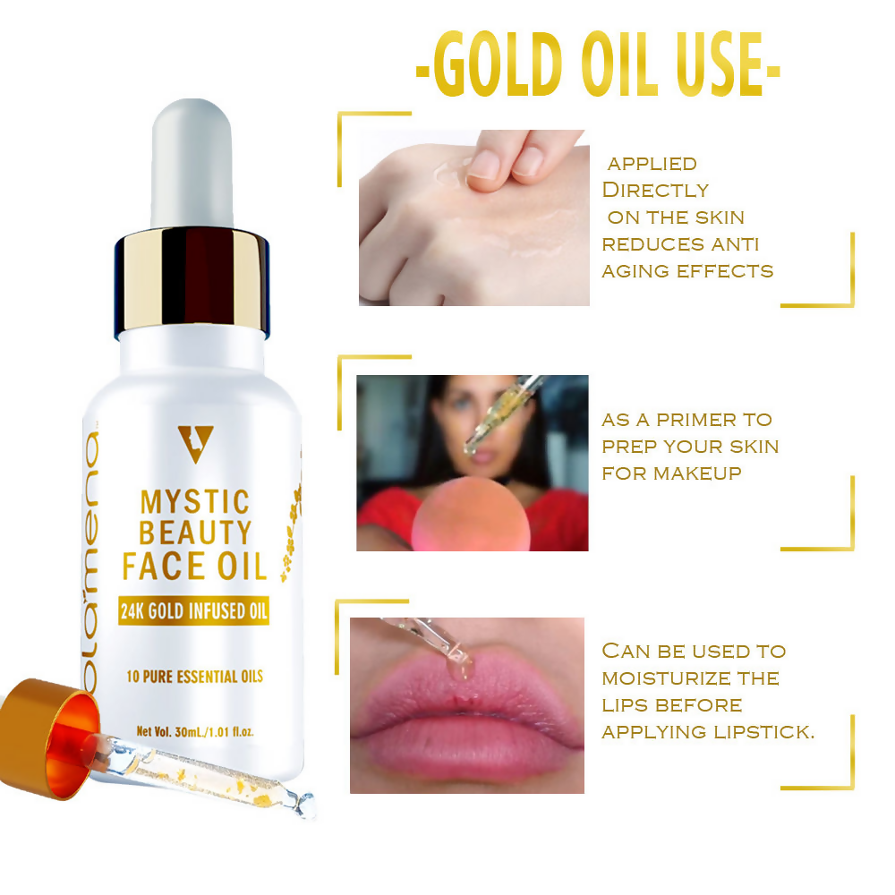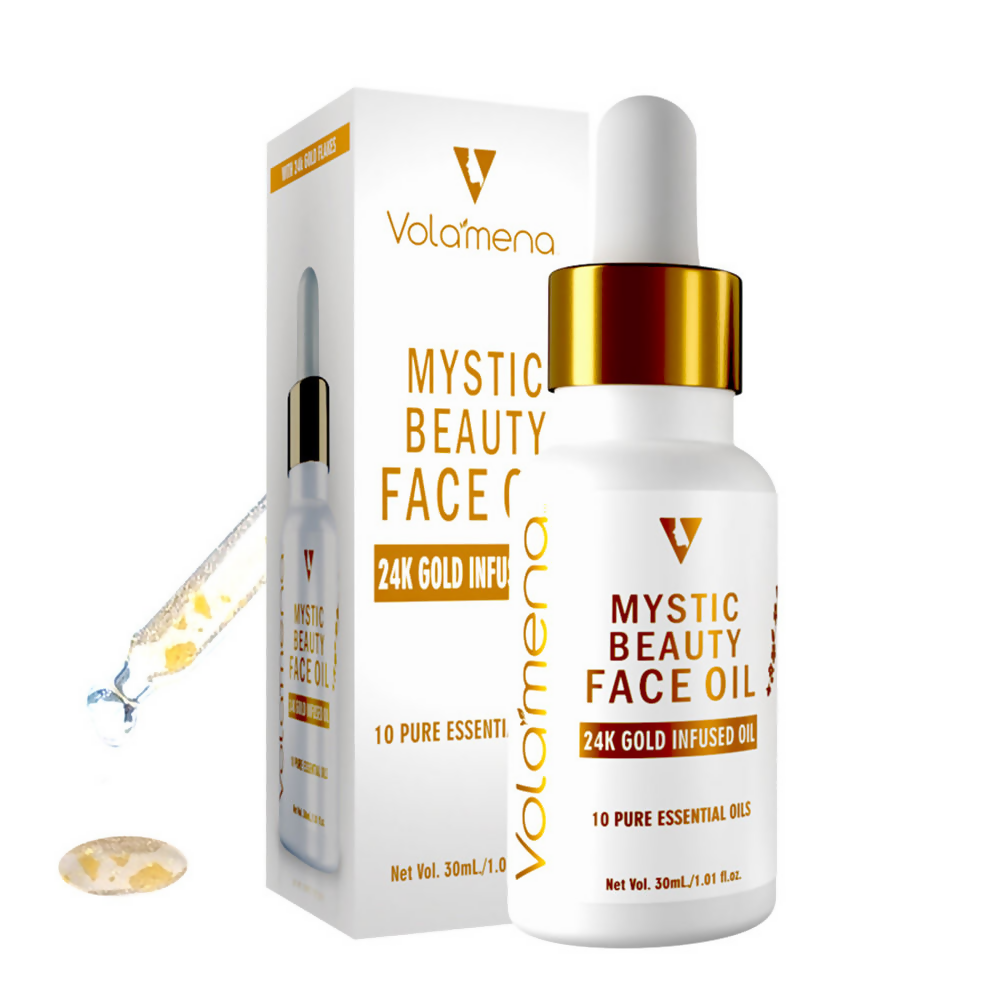 About the Product:- Volamena Mystic Beauty Face Oil is an extraordinary, swiftly-absorbing, lightweight beauty oil enriched with 24K gold, argan oil, and 10 pure natural essential oils. With just one application, skin appears nourished, smooth, revitalized, luminous, and glowing. Argan oil assists in minimizing the appearance of fine lines by deeply hydrating the skin, while 24K gold is absorbed directly, leaving the skin bright and naturally radiant.
