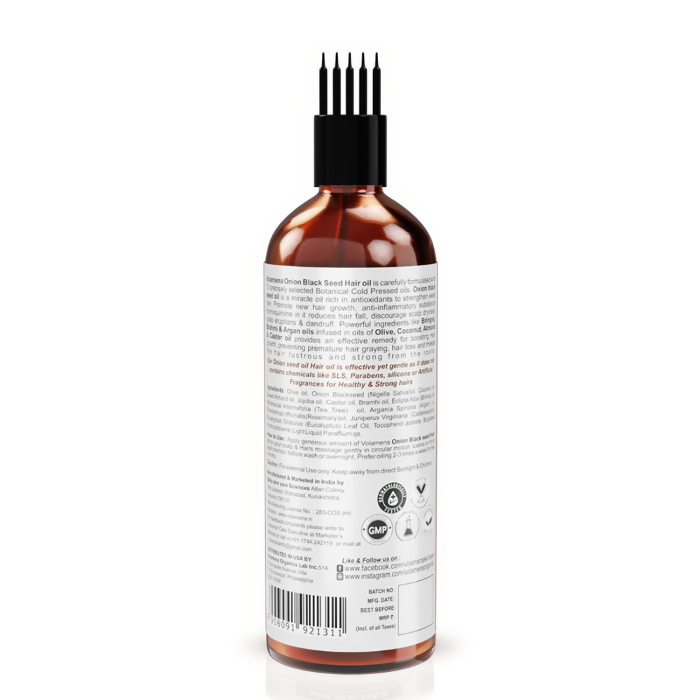 About the Product:- Volamena Onion Black Seed Hair Oil is meticulously crafted with 16 expertly chosen botanical cold-pressed oils. This extraordinary onion black seed oil, abundant in antioxidants, fortifies fragile hair and encourages new hair growth. Enriched with the anti-inflammatory compound thymoquinone, it helps reduce hair fall and addresses scalp dryness, eruptions, and dandruff. Potent ingredients such as bhringraj, brahmi, and amla, blended with olive, coconut, almond, and castor oils, offer an effective solution for enhancing hair growth, preventing premature graying, combating hair loss, and ensuring hair is glossy and robust from the roots.