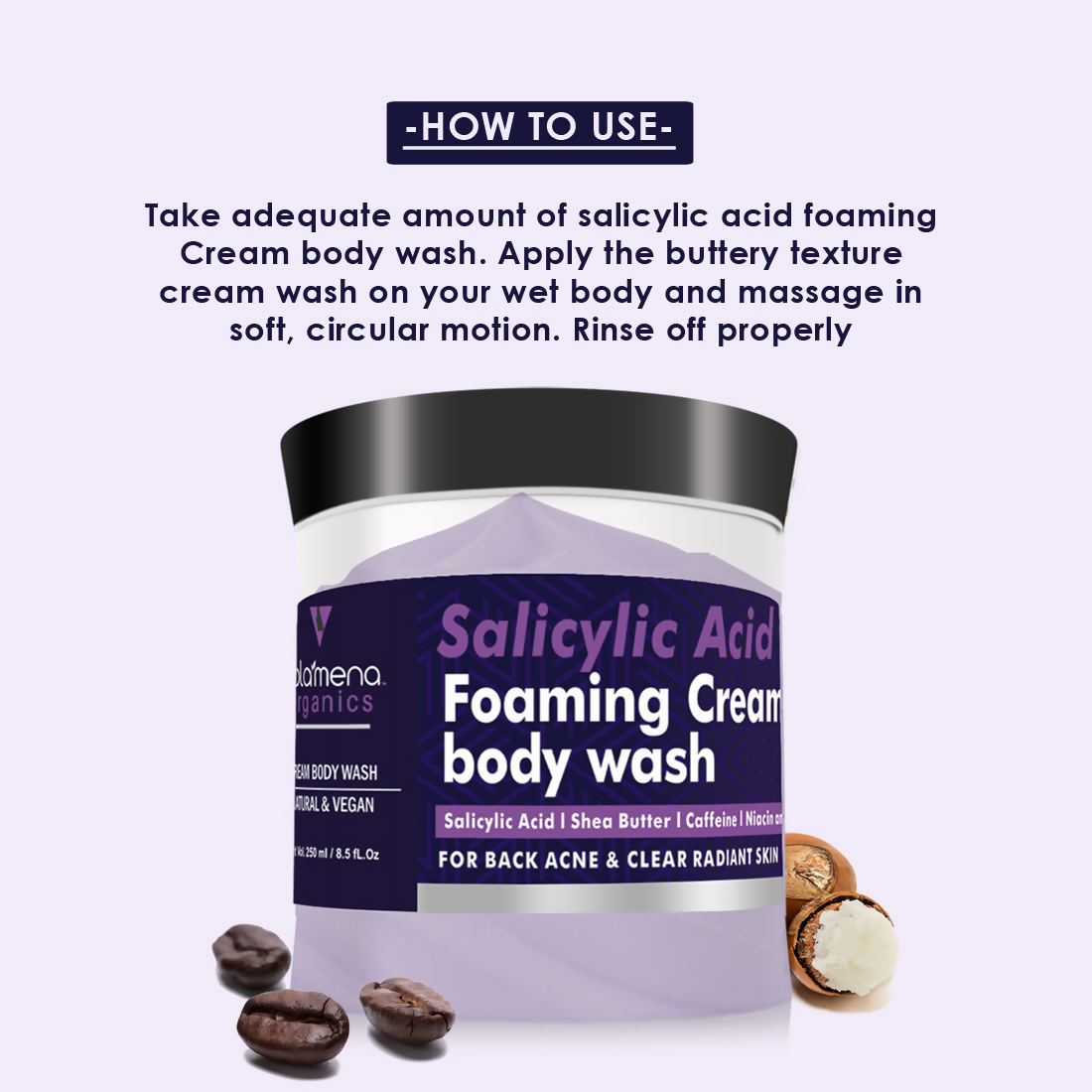 About the Product:- Experience the exclusive hydrating formula of Volamena Organics Salicylic Acid Foaming Cream Body Wash that gently nourishes and moisturizes your skin while cleansing, resulting in a stunning radiant glow. Enhanced with the richness of shea butter, it softens, smooths, and maintains the skin's natural pH balance. This luxurious radiance-boosting blend is enriched with salicylic acid and zinc PCA to help clear back acne and even out skin tone. Suitable for hydrating, cleansing, and nourishing all skin types, including dry and sensitive skin. All Volamena Organics cream body washes are cruelty-free and devoid of chemicals such as sulfates, parabens, harsh salt systems, colors, and silicones.