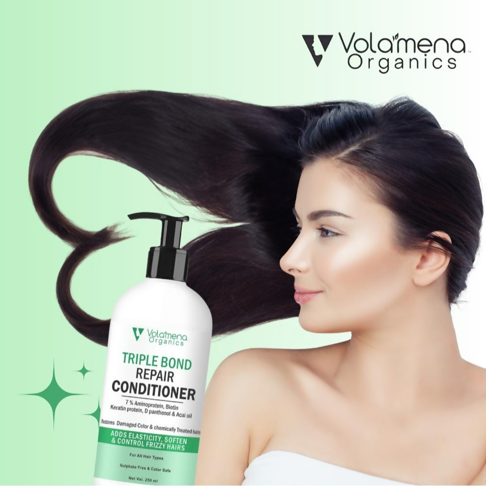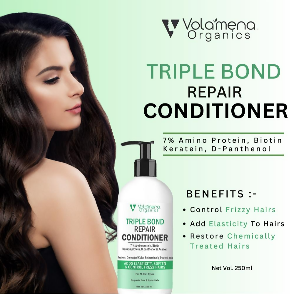 About the Product:- Volamena Conditioner is cruelty-free and devoid of chemicals such as sulfates, parabens, harsh salt systems, dyes, and silicones. Volamena Triple Bond Repair Conditioner operates on a molecular scale by mending hair proteins and sealing the cuticle for more resilient, flexible hair. Our exclusive Gluconamido bis Amodimethicone complex actively penetrates the hair follicle, revitalizing hair that has been previously harmed by styling, coloring, chemical treatments, and excessive processing. Our cutting-edge bond repair technology restores hair proteins while fortifying and reinforcing dry and damaged follicles. A luxurious blend of high-performance actives works in synergy with precious oils to create genuinely effective haircare suitable for both home and professional use.