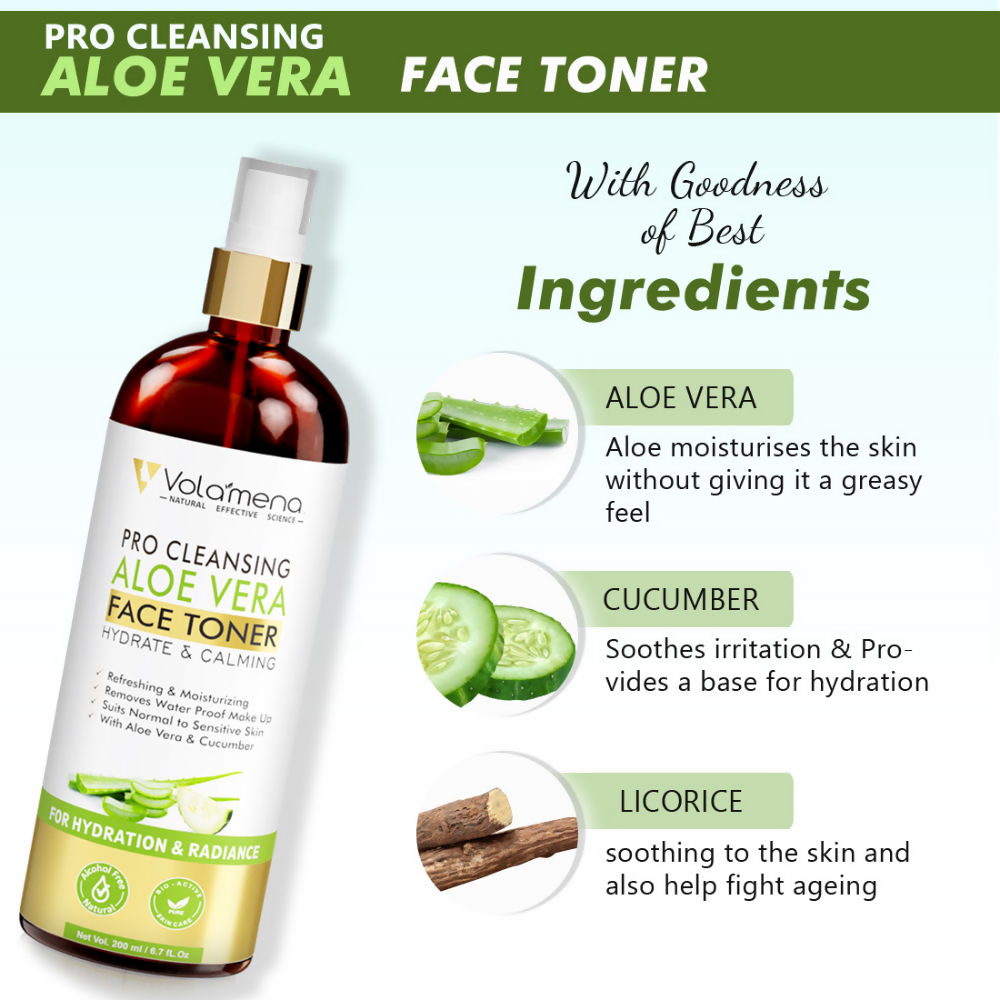 About the Product:- Experience the refreshing, clean, and soothing sensation on your skin with the alcohol-free Volamena Pro Clearing Aloe Vera Face Toner, expertly crafted to suit all skin types. Ideal for daily application, this face toner assists in purifying the skin, eliminating impurities and makeup. It effectively unclogs enlarged pores without causing dryness, leaving no greasy residue. The toner’s astringent qualities aid in minimizing pores, reducing the likelihood of blackheads and blemishes. Enriched with natural extracts known for their hydrating, soothing, and brightening effects such as licorice, chamomile, cucumber, and aloe vera, this multi-functional toner is also suitable for use by skincare professionals to prepare skin for optimal moisture absorption and other cosmetic treatments.